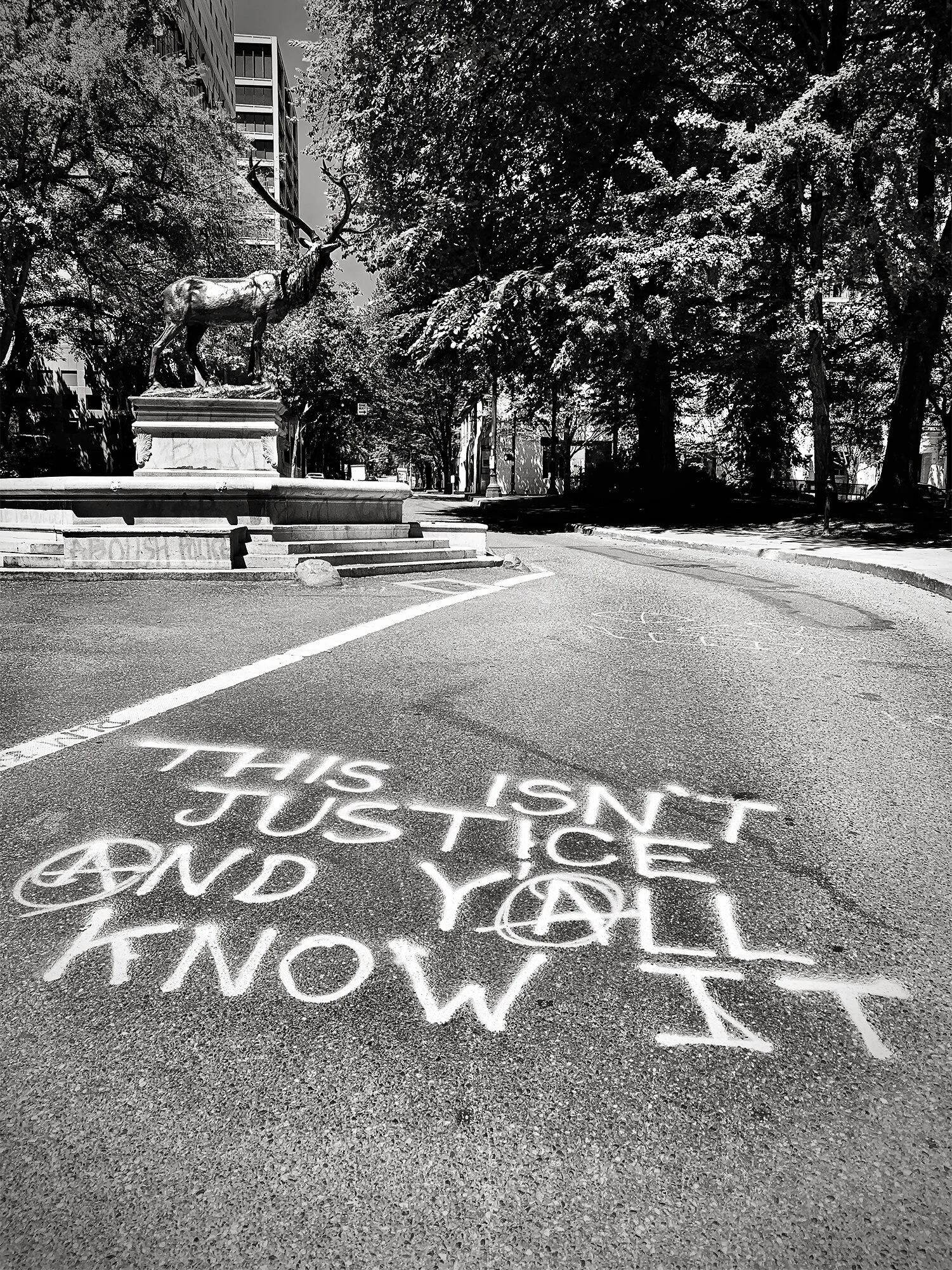Obviously, 2020 was a historical year for many reasons, but Portland, Oregon was in the national news more than usual due to many months of Black Lives Matter protests. Understandably, the photography used in the news and social media was comprised of individual protesters out on marches and in the streets, but I saw it all from a different angle. As an urban landscape photographer, I am always focused on architectural forms so I was fascinated with the complexities and constant change of the built environment during this time. I was enthralled by how often the facade of the city — its buildings, boarded windows, doors, and signage — were changing daily due to the pandemic then it increased twofold as the protests started. Between June 2020-November 2020, I walked around much of Portland at regular intervals taking photos of the murals, signs, messages, and graffiti that were being rotated in and out of existence. They would appear, then get covered, and immediately new messages reappear. So many people wanted to express different messages imprinted onto buildings, sidewalks, and roads. They showed a dramatic mix of anger, injustice, hate, hope, support, and love — a spectrum of emotions. I have never seen such visible, long-lasting, outward expression in response to a national or local event. It was also confusing to understand the dynamics as different news outlets reported different angles and mixed messages. What was a protest versus a riot? Approved murals versus graffiti? What was peaceful, damaging, placating, or just plain marketing? For me, through all the complexity, it was clear a revolution was happening. I was compelled to document what I witnessed but my place in all this was to listen and take it all in: the news, articles, books, posts, talks, interviews…and including the messages on the walls.