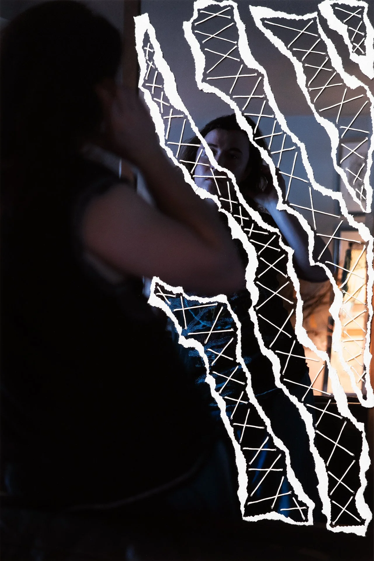 In addition to collaborating on ideas for the images, he sews on some of the prints, leaving a physical mark of his presence on the photographs. The process of sewing on the prints is mirrored in his clothing. He views the way he presents himself through ornamentation as simultaneously making his life more beautiful and worth living while consuming time that he knows is limited.