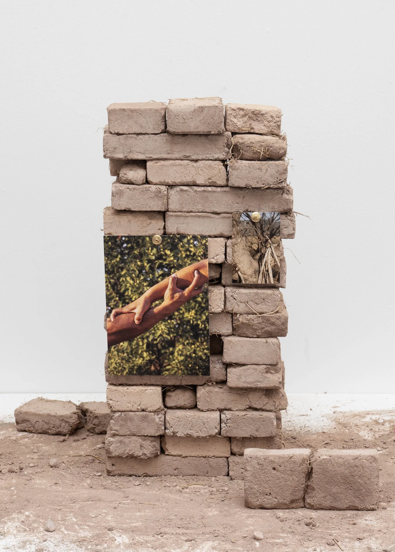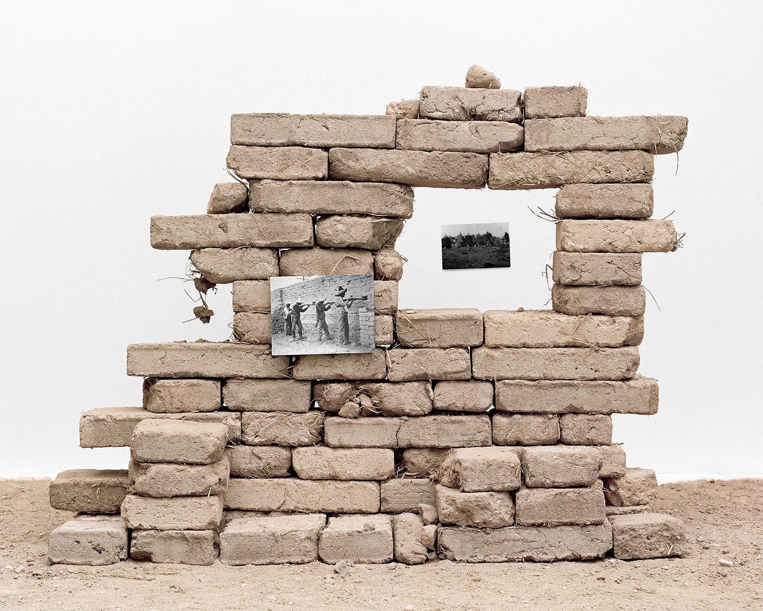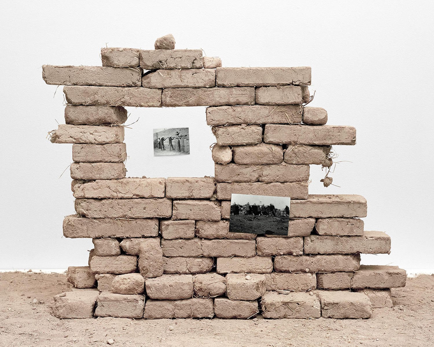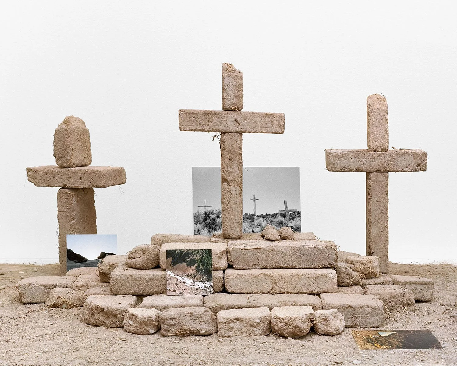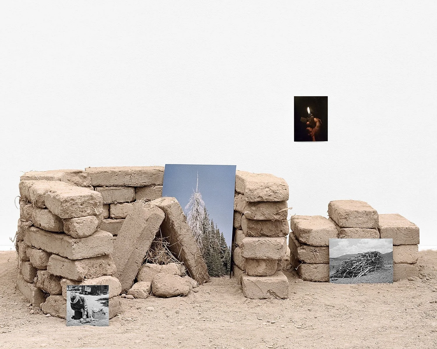 I utilize black and white archival photographs and personal color photographs, together with handmade adobe bricks, to construct cultural, religious, and landscape-centered compositions related to my Mexican heritage. These compositions are carefully staged and photographed using a medium-format film camera. The meticulously crafted sets unify symbolism, photographic deep time, and shared experience across a single print. The constructed compositions serve as both physical and metaphorical monuments, relating to the geography that I and others have traversed in laying the foundation for Mexican Americans. Including sourced historical photographs helps me establish a layer of internal processing in a way that traditional photographs cannot achieve. The compositions become self-portraits as reflections of myself begin to emerge from the constructed monuments.